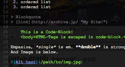 はてな記法とかWiki記法とかの親戚。text‐to‐HTML な軽量マークアップ言語です。変換前の素の状態でも easy‐to‐read なのが売り。書きやすいし。VimWikiの記法がこれなら完璧なんだけどなー。日本ではあんま聞かないけど、MTとかBlosxomとか対応していたり、意外とメジャーだったりします。Vimでもmkd.vimというシンタックスファイルが公開されてますね。