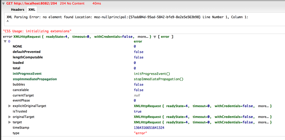 | _comment1: | Here's a test example code, firebug console logs, and sample nginx.conf to setup 204's: \ \ https://gist.github.com/ojak/5241273 \ \ I tested on Firefox 19 and Chrome 25.0.1364.172 (although Chrome needs to be run with flags to avoid Access-Control-Allow-Origin issues). → 1364250309685894 |