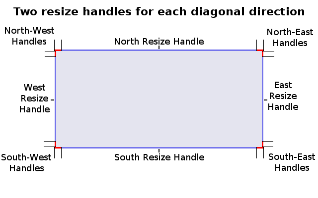 The corner handles, e.g., north-west handle, are square and therefore are either too small or extend into the content area.