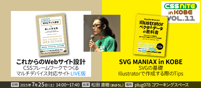 来週7月25日(土)の開催となりましたCSS Nite in KOBE, Vol.11 松田 直樹さん(まぼろし)による「これからのWebサイト設計〜CSSフレームワークでつくるマルチデバイス対応サイト LIVE版」&「SVG MANIAX in KOBE」。