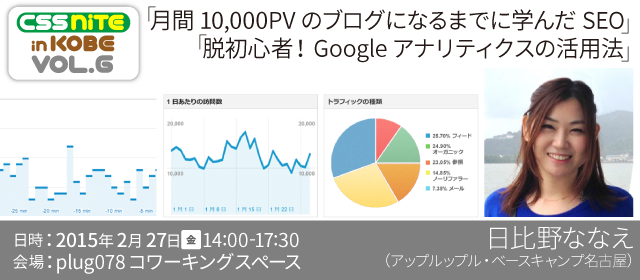 のトピックで、Googleアナリティクスの基本と、GAの結果を元にコンテンツ(記事)の改善に繋げていくかというPDCAの部分を、日比野ななえさん(アップルップル/ベースキャンプ名古屋)に3時間じっくりお話いただきます。