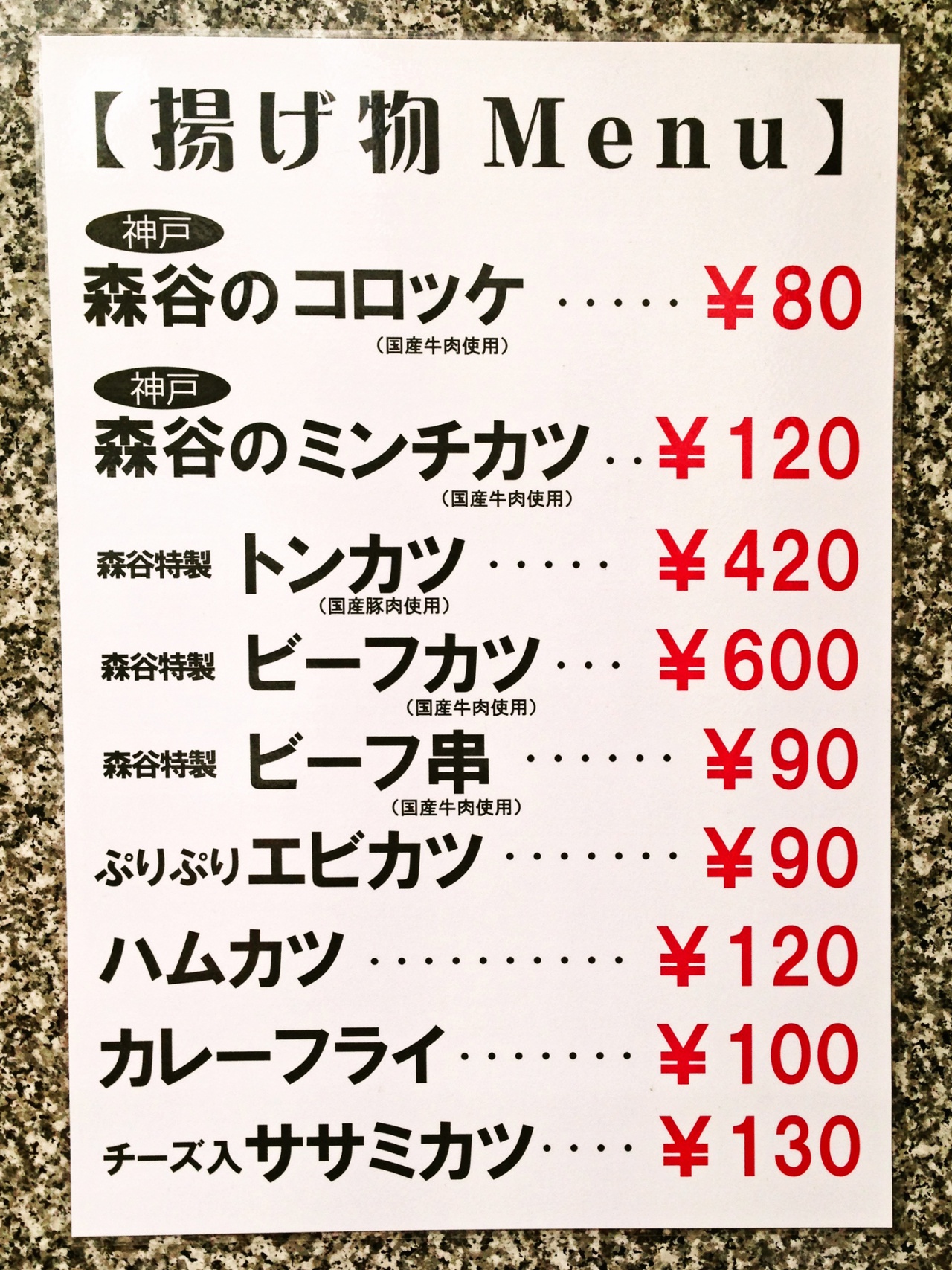 本当は「本神戸肉 森谷商店」という名前で、お肉屋さんです。中へ入ると神戸牛も販売しており、食べるとしあわせになります。もちろんコロッケも安くておいしい!食べあるきもいいですよ。