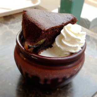 ツボの上に、あったかい栗入りチョコレートケーキが乗っているんです。