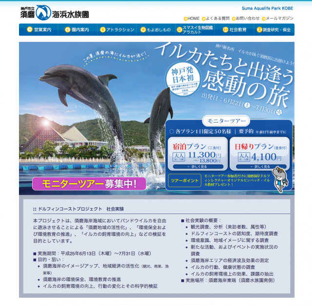 モニターツアーは、イルカをテーマに見る・体験・食・教育を兼ね備えた企画となっており、「神戸発・日本初"イルカたちと過ごす感動の二日間"」(一泊二日プラン)のほか、「須磨海浜水族園と須磨浜ドルフィンウォッチング(日帰りプラン)」があります。