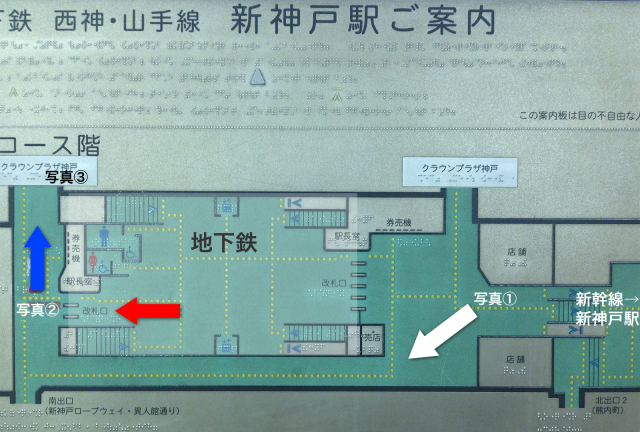 新幹線のホーム方面から来られる方は、地下鉄へ行くエスカレーターをひたすら下ってください。地下鉄の改札口が見えたら、売店ファミマの左の通路を抜け反対側に出ます。(写真A:白矢印)