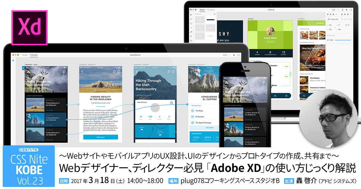 昨年11月6日・7日に開催した「神戸ITフェスティバル 2016」web関連セッションで、この「Adobe XD」を、CC道場でおなじみの仲尾さんに解説していただきましたが、50分という短い時間だったため「もっと深く聞きたかった」という感想が多かったので、今回は、XDの最新情報や使い方を、Adobe webブロダクト担当の轟さんがデモを交えながらじっくりと解説します。