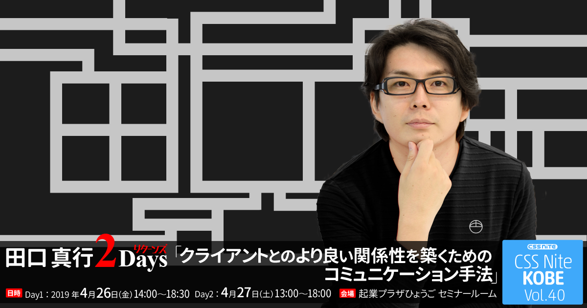 CSS Nite in Kobe, vol.40 は、4月26日・27日 ディレクションにおけるコミュニケーションについて取り組みます。