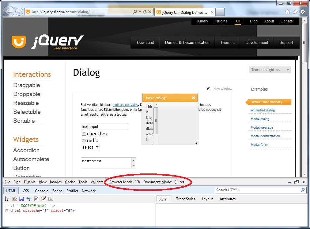 I have found a bug in jQuery dialog - it has strange behavior when dragging and resizing a dialog in IE6 or IE7 and up in Quirks Mode.