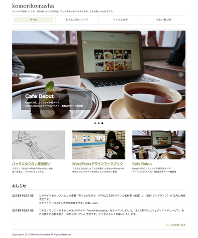 サンプルサイトは、著者らが主催する「komorikomasha」というグループが制作した作品を紹介するサイトです。