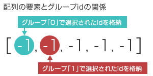 情報をどのように格納するかというと、0番目の要素にグループ「0」で選択されたidを、1番目の要素にグループ「1」で選択されたidをといったように、各要素毎にグループで選択されたidを格納していきます。