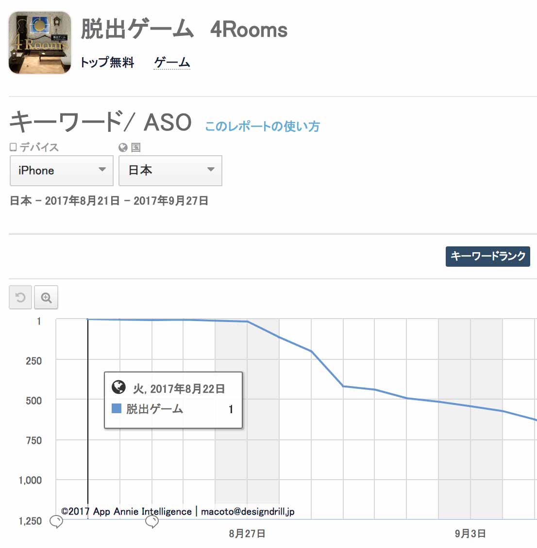 少しの違いは感じますがASOでも似た傾向があります。私のアプリでも以下のように複数ワードの方がランキングの下落が緩やかになっています。脱出ゲームの上位常連のチームでは、このテクニックを利用している所が多い(気がします…)。