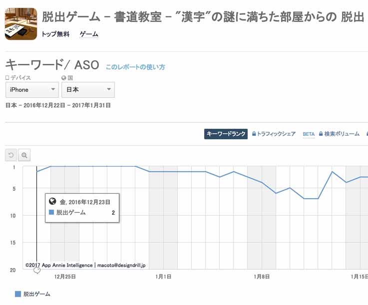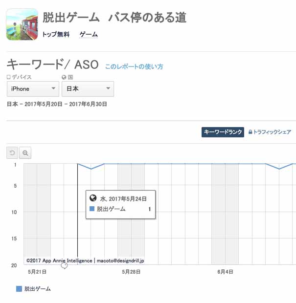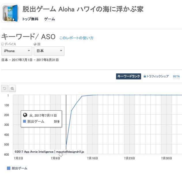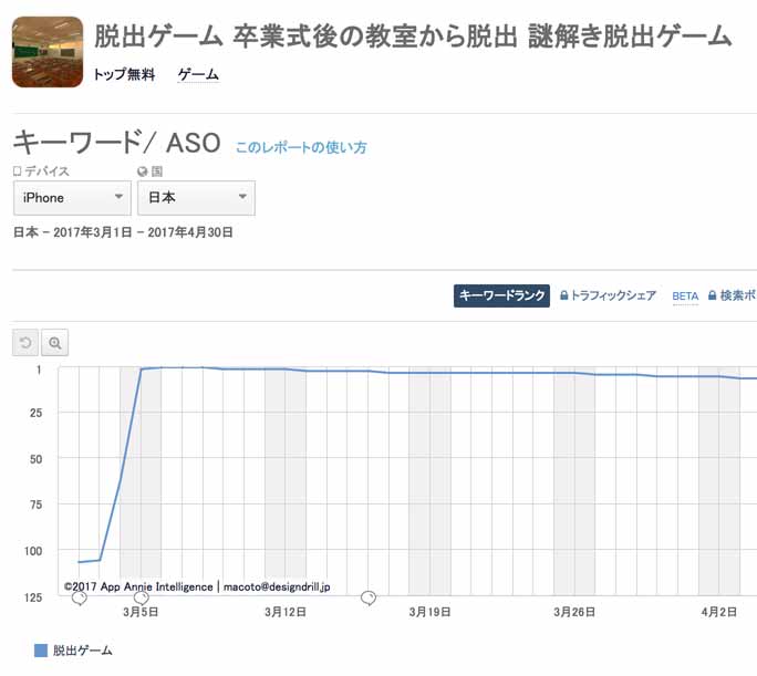 とはいえ1件のデータでは判断できません。App Annieを利用すると他の脱出ゲームの結果も見ることができるので幾つか調べてみました。同じように初めから上位に配置されるアプリもありました。
