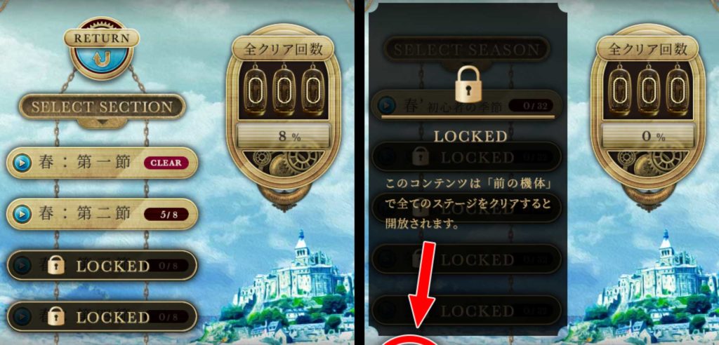 メニュー画面の右側では「全クリア回数」を表示しています。攻略したステージに応じて%が増えていき、全ステージをクリアすると「クリア回数+1」というボタンが表示されます。