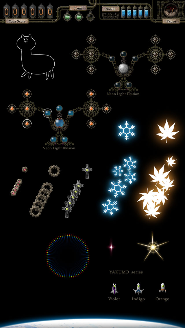 自機は3種類用意します(下画像)当たり判定は緑丸の部分。初心者用の「Orange」はシールドが5つ(6発被弾でGameOver)で最大だがショットが弱い(ホーミング1x直進弾1)アイテムはデコイ。上級者向けの「Indigo」はシールドが2つだがショットが強い(直進弾x5)アイテムは一定時間弾が壁に反射する(死角から攻撃可能)。中級者向けの「Violet」はシールドが3つでショット普通(3way弾)アイテムは弾幕削除。