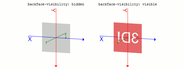backface-visibilityプロパティbackface-visibilityプロパティは、要素の裏側を表示するかどうかを指定するプロパティです。hiddenとvisibleが使用可能で、初期値はvisibleとなっています。hiddenを指定すると、要素の表面が見えなくなった(たとえばrotateY(180deg)された)場合に、その要素は見えなくなります。visibleの場合は、その要素を裏側から透かして見るような感じになります。transform: rotateY(180deg)した要素のbackface-visibilityプロパティに、それぞれhidden, visibleを指定すると次のようになります。