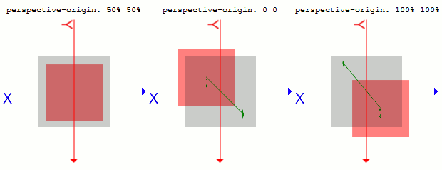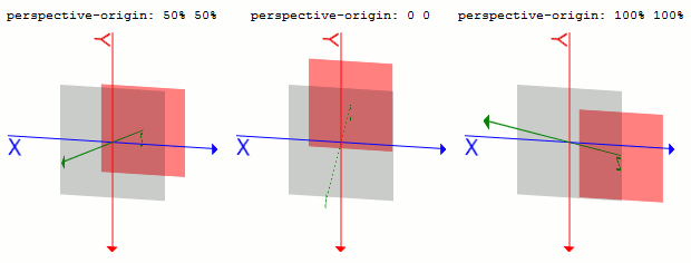 違いは、perspective()関数が要素そのものの深度を指定するのに対し、このperspectiveプロパティでは、指定した要素の子要素全体の深度を指定することにあります。0より大きい値を指定しなければなりません。perspective-originプロパティperspectiveプロパティの視点ポイントの位置を指定します。値は2つあり、X方向Y方向の座標を指定します。