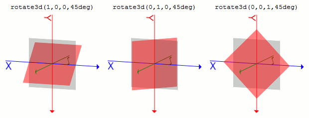 rotate3d()からmatrix3d()へrotate3d(x, y, z, a)は、その関数の項目で書いたようにmatrix3d(1+(1-cos(angle))*(x*x-1), -z*sin(angle)+(1-cos(angle))*x*y, y*sin(angle)+(1-cos(angle))*x*z, 0, z*sin(angle)+(1-cos(angle))*x*y, 1+(1-cos(angle))*(y*y-1), -x*sin(angle)+(1-cos(angle))*y*z, 0, -y*sin(angle)+(1-cos(angle))*x*z, x*sin(angle)+(1-cos(angle))*y*z, 1+(1-cos(angle))*(z*z-1), 0, 0, 0, 0, 1)となります。