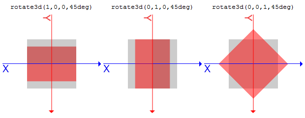 2Dのmatrix()でも触れましたが、degreeaはa * π / 180でradianに変換できます。rotateX()はmatrix3d(1, 0, 0, 0, 0, cos(a), sin(a), 0, 0, -sin(a), cos(a), 0, 0, 0, 0, 1)となります。