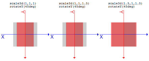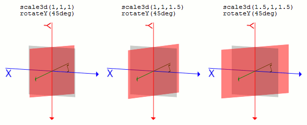変形の最終的な座標は行列によって計算されるわけですが、仮にtransform: 関数A 関数Bという変形を行うとすると、関数Aの行列 * 関数Bの行列となり、そこから座標が計算されるということです。AとBがあるとき、A*BとB*Aは別物となります。transformプロパティに指定する関数は書いた順に適用される、と覚えておけばいいと思います。3Dでの回転について