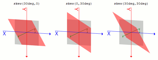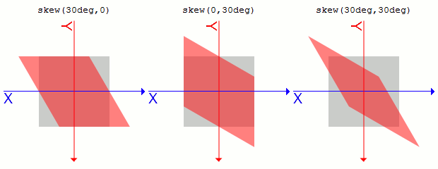 skewX(), skewY()からmatrix()へskewX(a)はmatrix(1, 0, tan(a), 1, 0, 0)で表せます。aはrotate()のときと同じです。
