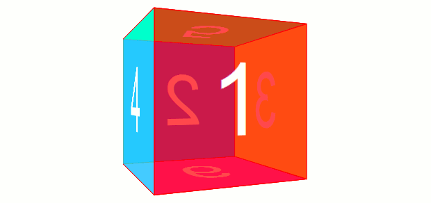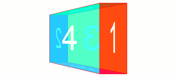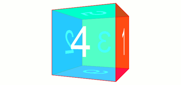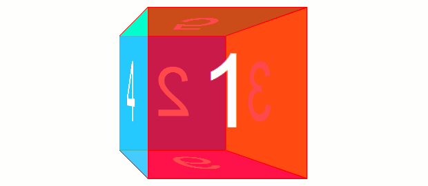 ですが3D Transformsにおいて回転変形を行うと、その要素の各軸は回転に伴って移動します。たとえば、rotateY(180deg)すると、その要素は裏返したような状態になりますが、このときX軸は右から左へ、Z軸は手前から奥へ、となります。transform: rotate(180deg)したものを奥にあるように見せるには、rotate(180deg) translateZ(100px)とします。translateZ(100px) rotate(180deg)では手前側に移動した後に回転となるので、手前側にあるように見えます。translateZ()を先に書くなら、translateZ(-100px) rotate(180deg)とします。回転する立方体を作ってみる