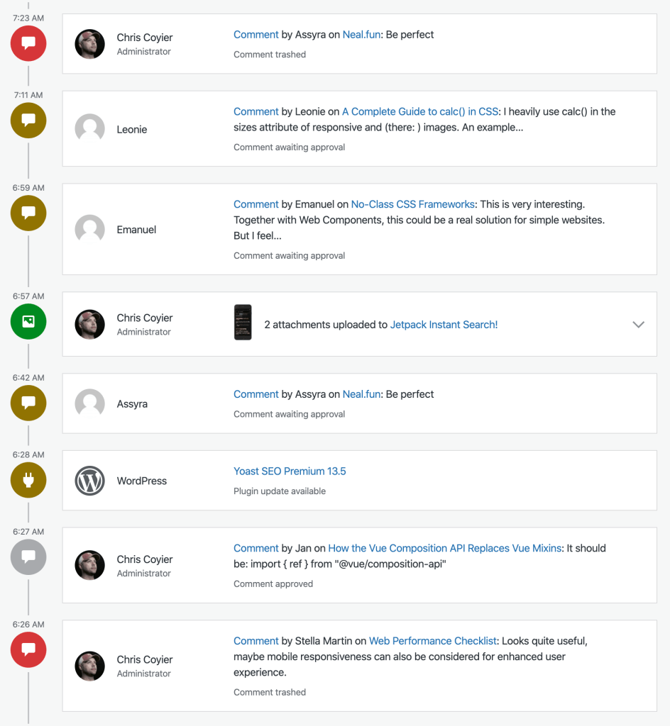 We sleep easy at night knowing CSS-Tricks is entirely backed up in real-time. That’s all the files of course, like WordPress itself, my theme, and plugins, but also the entire database and all the media files. The activity log lets us know who did what and when.