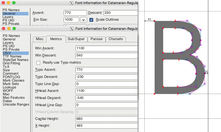 Возьмем шрифт Catamaran и откроем его в FontForge, чтобы увидеть метрики: