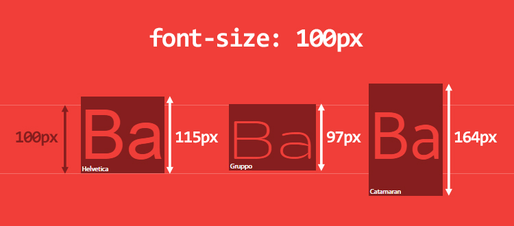 Даже если мы в курсе этой особенности, почему font-size: 100px не делает элементы высотой 100px? Я измерил эти значения: Helvetica — 115px, Gruppo — 97px и Catamaran — 164px.