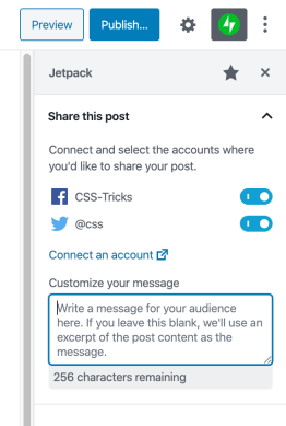 We like to tell the world as best as we can when we publish new content. Rather than having to do that manually, we can share the post to Twitter and Facebook the second we hit that “Publish” button.
