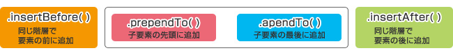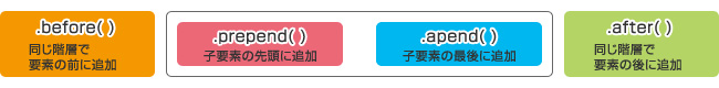 上記で同じ機能のメソッドが2つある(例えばafterとinsertAfter)のは以下の様に、「追加する対象」と「内容」が入れ替わった構文があるためです。以下の例はafterとinsertAfterの例です。