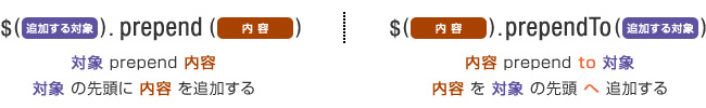 jQo.prepend( コンテンツ [,コンテンツ2] )ver1.0〜
