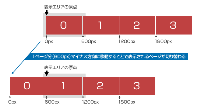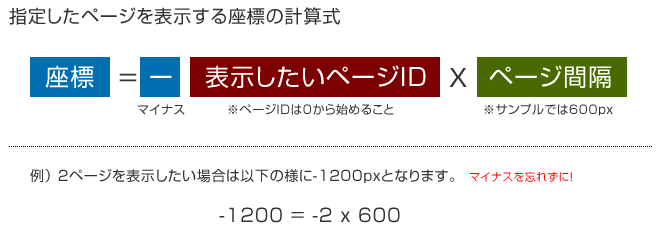 ここで着目するのはページ番号が0から始まっている点です。この様にしておけば、ページを表示する際の座標計算がラクになります。例えば0ページを表示したい時は0pxの位置、1ページを表示したい時は-600px、2ページを表示したい時は-1200pxと以下の様な簡単な計算式で求まるからです(マイナスを忘れないで下さい)。