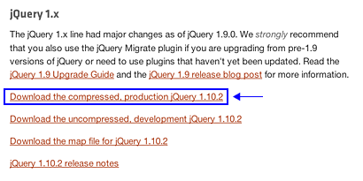 jQueryは公式ページ「download」からダウンロードできます。左図のようなページ構成になっているので、jQuery1.xの項目からダウンロードして下さい。