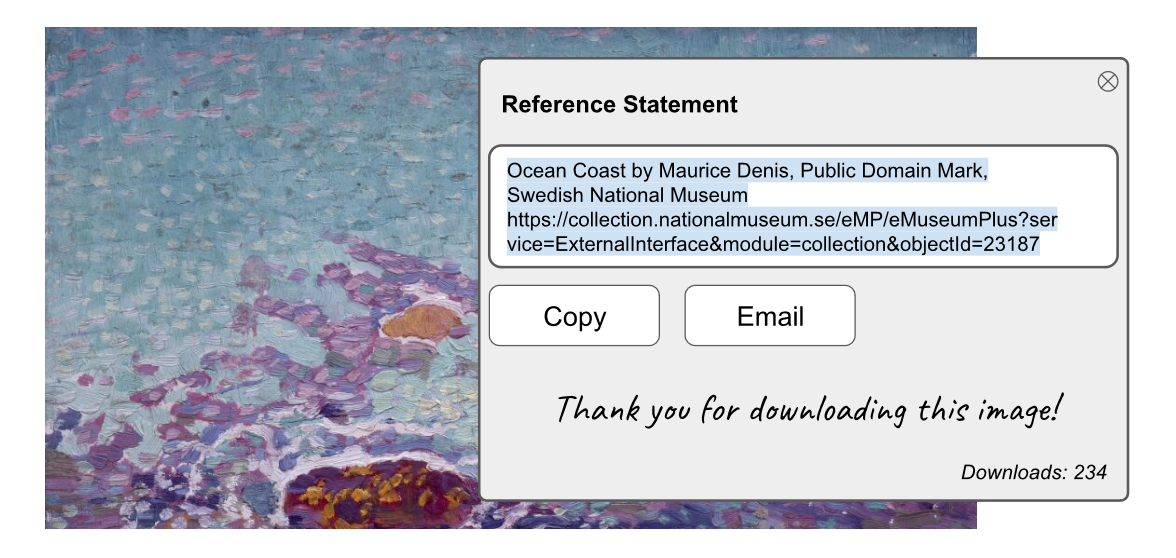 そしてワーキンググループの挙げた社会的介入策に触発され、私たちは、オープンライセンスまたはパブリックドメインの資料を利用する人々が資料を提供している所蔵機関に言及することを簡単かつ魅力的にするために、所蔵機関が導入できるシンプルなデザインアイデアを開発しました。Behavioural Insights Team の EASTモデル (「ナッジ」によって行動変容を起こしたり、特定の結果を促したりするためのシンプルなフレームワーク)を使って、適切な場面で所蔵機関が包括的な「典拠ステートメント」を提供するためのいくつかの方法を提案します。これらのユーザー・エクスペリエンスに関するアイデアは、CCライセンスやその他ツールと組み合わせて使用することができます。提案する機能の実装方法に関するHTML/CSSコードを含む技術的なガイドラインは提供しませんが、このリソースが各所蔵機関の技術環境に実装可能なデザインの青写真となることを願っています。