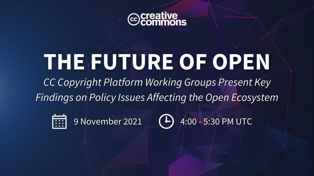 Throughout 2021, four working groups of the Creative Commons Copyright Platform are undertaking an exploration of policy issues affecting the open ecosystem, in line with the Creative Commons 2021-2026 strategy. In this blog post, we present the four working groups and introduce you to their leads. Generally, the Platform is a space for copyright and…