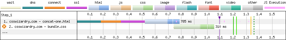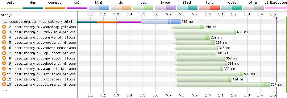 When we talk about downloading files, weāgenerally speakingāhave two things to consider: latency and bandwidth. In the waterfall charts above, we notice we have both light and dark green in the CSS responses: the light green can be considered latency, while the dark green is when weāre actually downloading data. As a rule, latency stays constant while download time is proportional to filesize. Notice just how much more light green (especially compared to dark) we see in the many-files version of Bootstrap compared to the one-big-file.