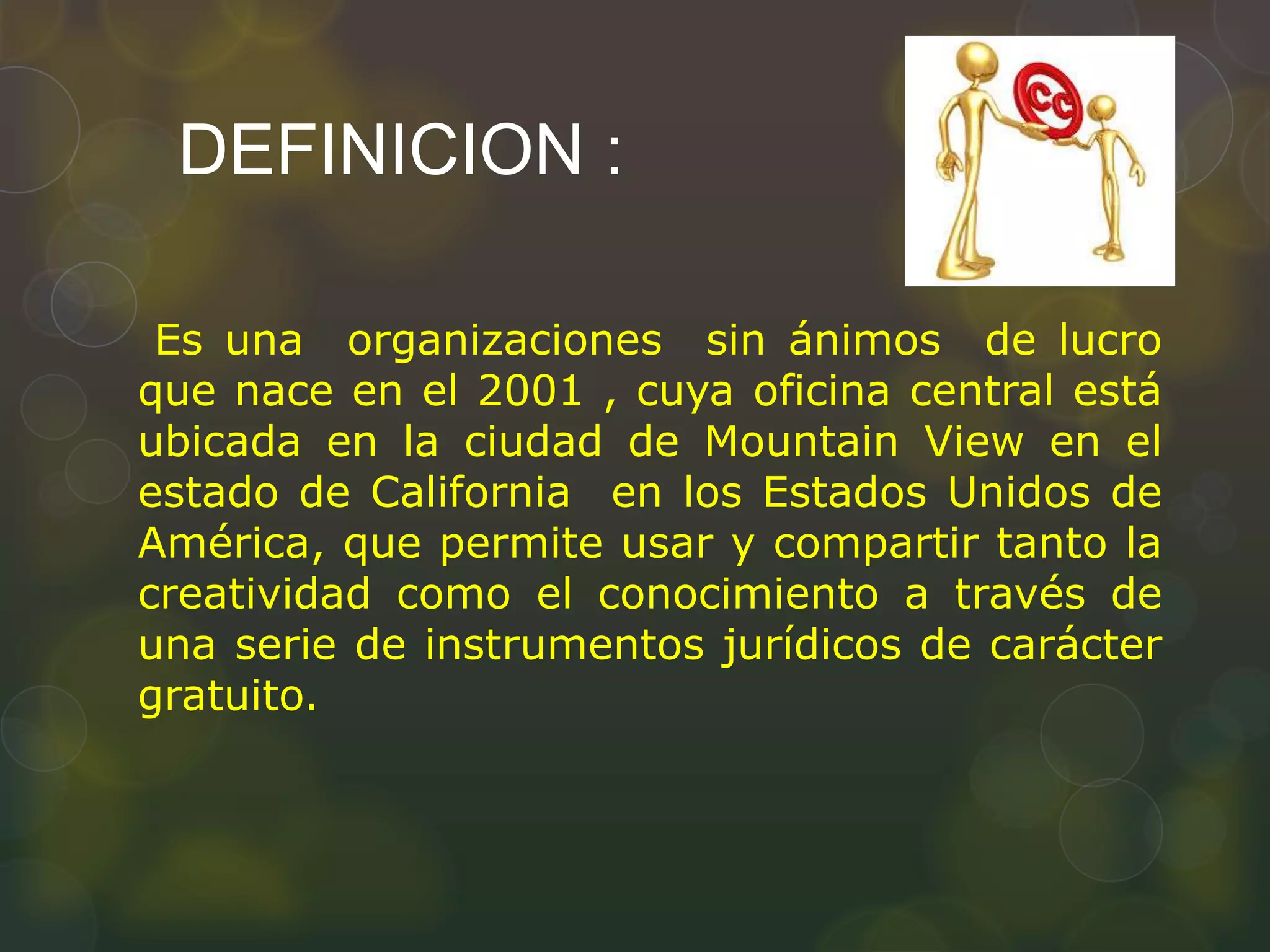 Creative Commons es una organización sin fines de lucro fundada en 2001 para permitir que la creatividad y el conocimiento se compartan a través de licencias gratuitas. Ofrece seis tipos de licencias que permiten a los autores especificar qué derechos reservan sobre sus obras y qué uso pueden hacer otros. El objetivo es fomentar la colaboración y ampliar la cultura mientras se respetan los derechos de autor.
