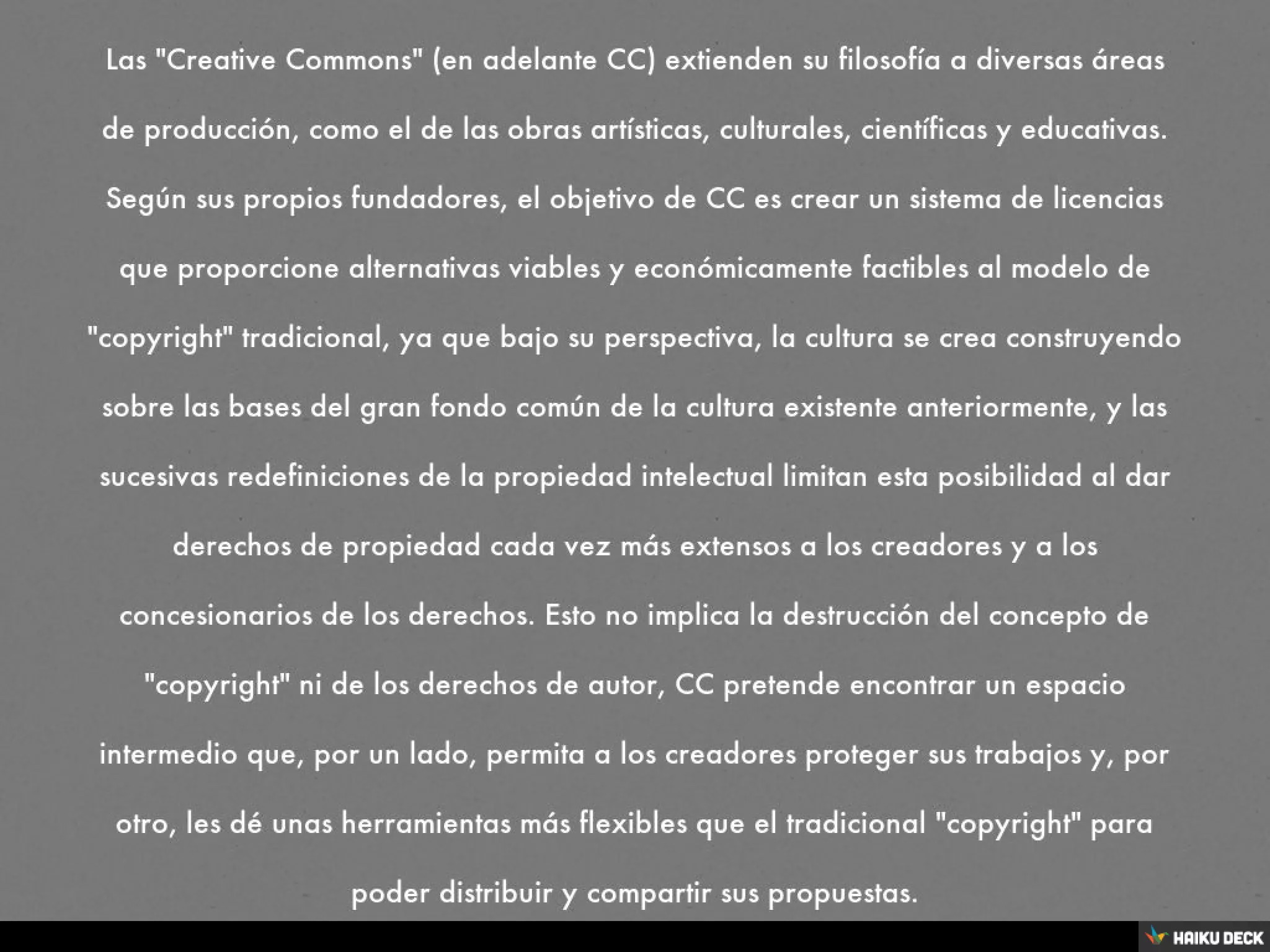 Este documento describe Creative Commons (CC), una organización que crea licencias alternativas al copyright tradicional. CC permite a los creadores elegir qué derechos de autor renunciar para permitir un mayor intercambio y distribución de obras artísticas, culturales, científicas y educativas. Las licencias CC permiten la copia y distribución de obras con ciertas condiciones como el reconocimiento del autor original, fines no comerciales, prohibición de obras derivadas o redistribución bajo la misma licencia.