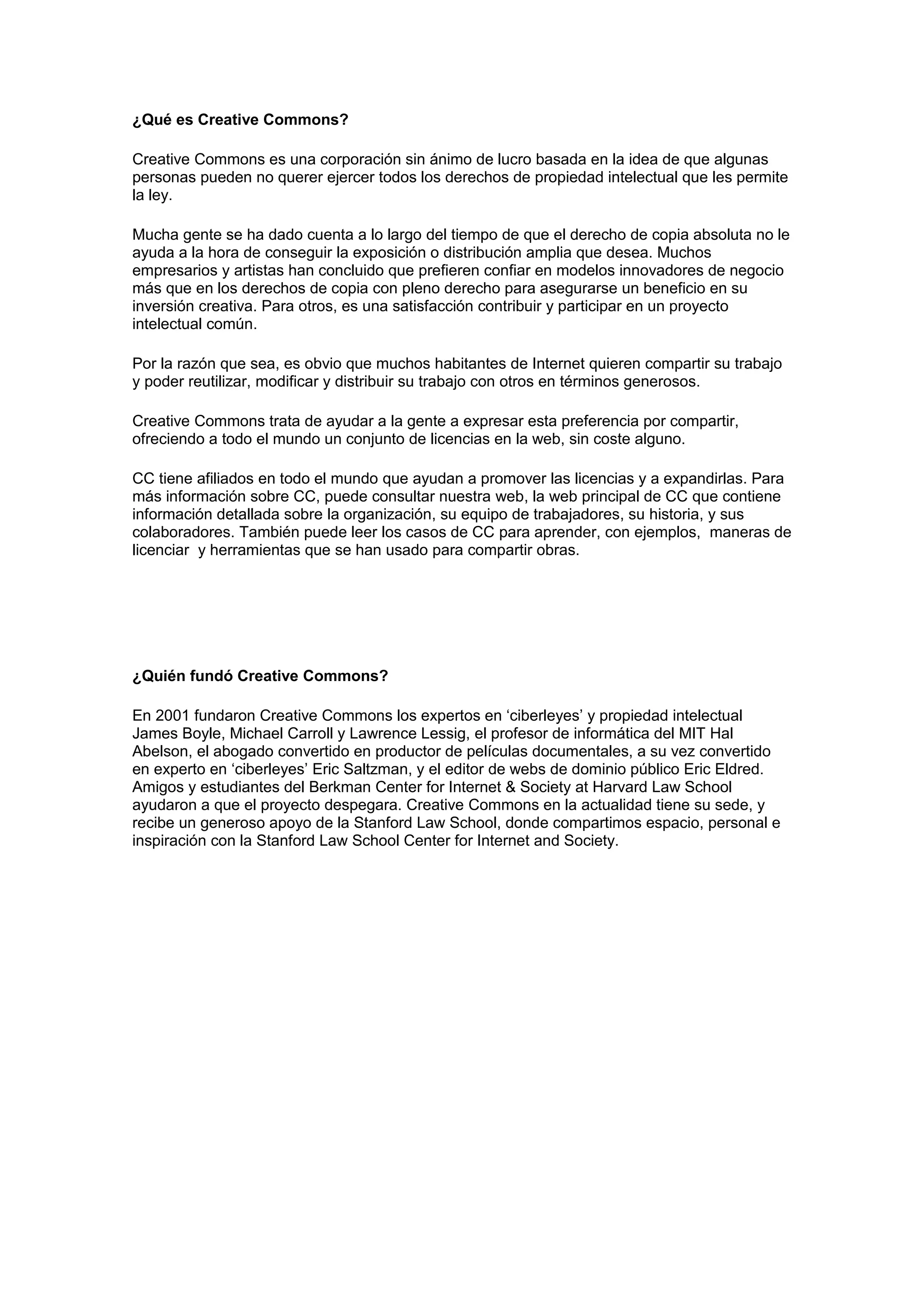 Creative Commons es una organización sin fines de lucro que ofrece licencias gratuitas para permitir que las personas compartan y reutilicen el trabajo creativo de otros de manera legal y fácil. Fue fundada en 2001 por expertos en derecho para abordar los problemas de que las obras están automáticamente protegidas por derechos de autor y no hay una forma fácil de identificar trabajos disponibles para su reutilización. Las licencias Creative Commons brindan una alternativa al derecho de autor predeterminado al permitir a los creadores expresar su preferencia por compartir su trabajo