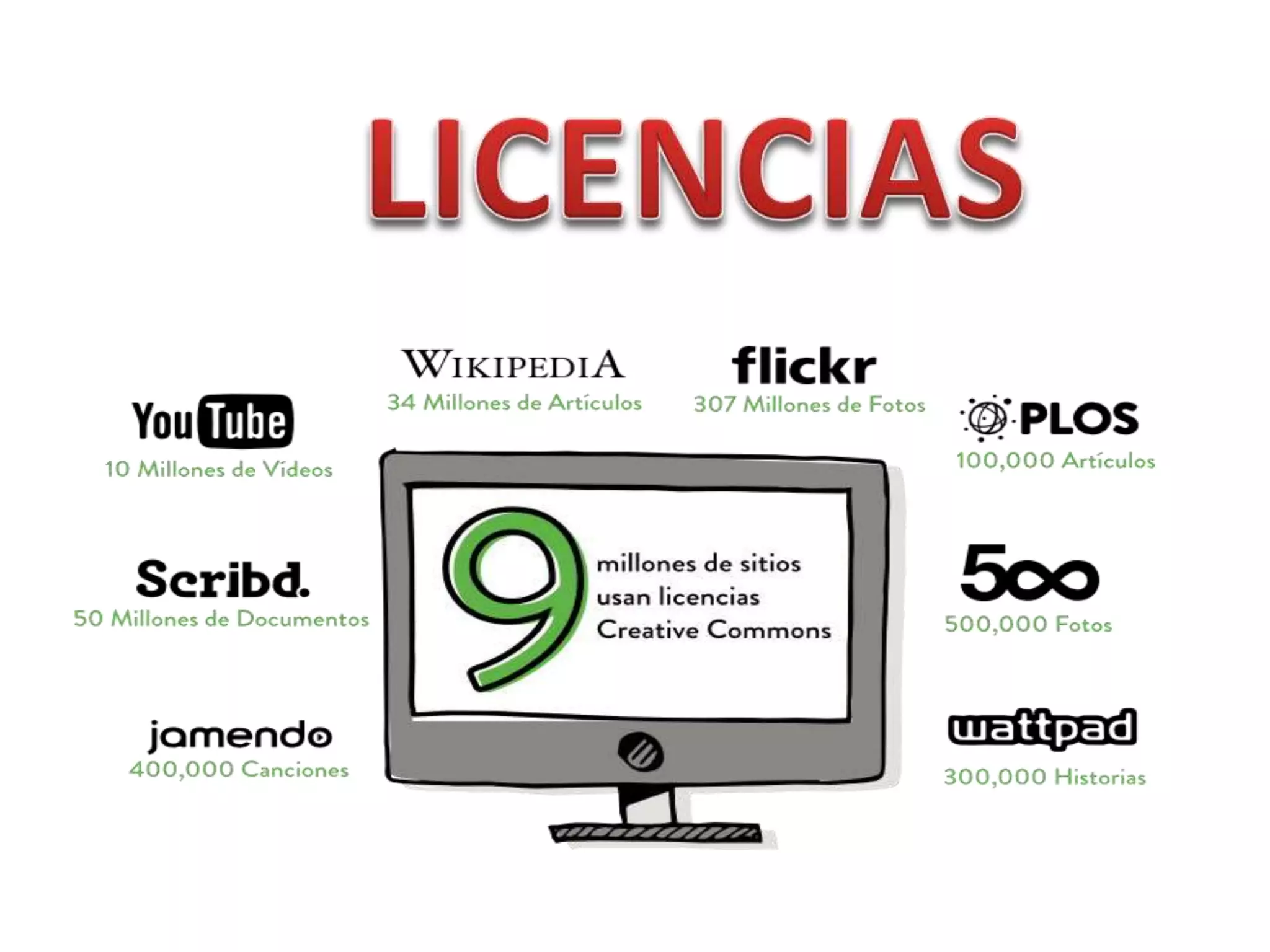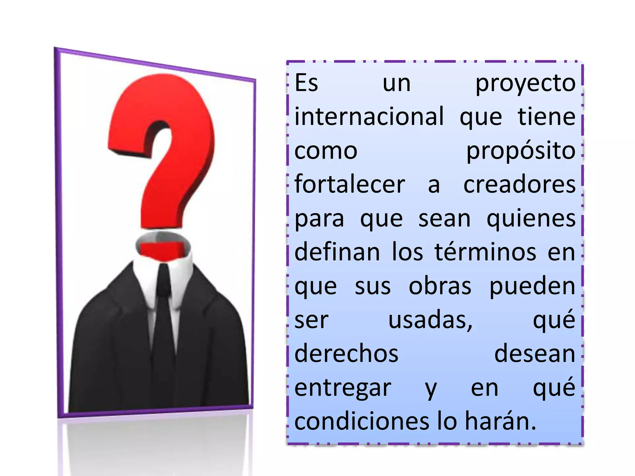 Creative Commons es una organización sin fines de lucro que ofrece licencias para permitir que creadores compartan sus obras y permitan ciertos usos, como distribución y modificación, manteniendo algunos derechos reservados. Ofrece seis tipos de licencias que van desde permitir todo uso con atribución hasta solo permitir descarga y distribución sin cambios ni uso comercial. El objetivo es promover la creatividad al facilitar el uso y modificación de obras dentro de ciertos límites establecidos por el creador.