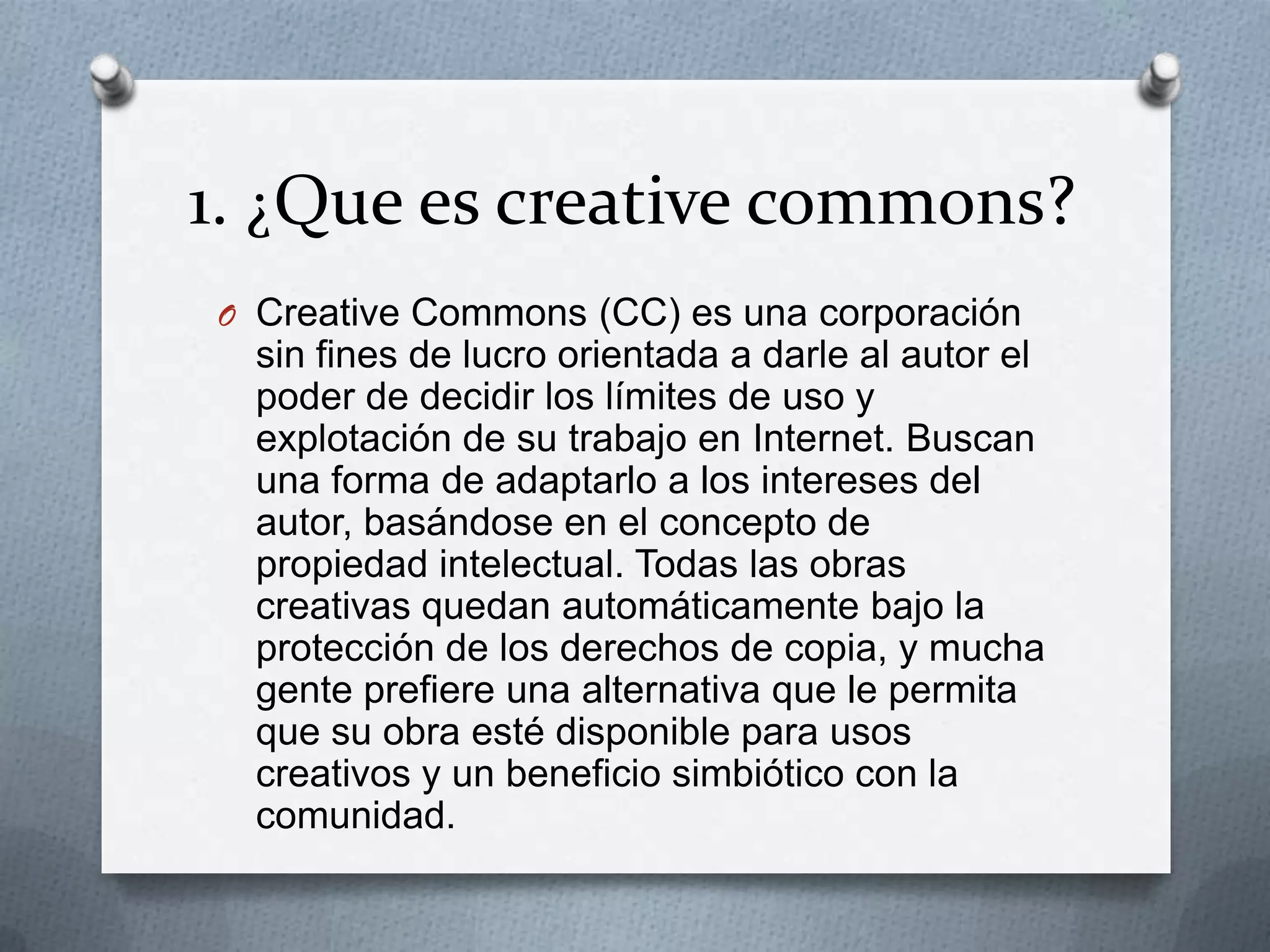 Creative Commons (CC) es una organización sin fines de lucro que ofrece varias licencias de derechos de autor que permiten a los creadores especificar cómo pueden usarse sus obras. Las licencias CC permiten el uso compartido y la creación de obras derivadas para fines no comerciales. Hay seis licencias principales que varían en si permiten usos comerciales, obras derivadas, y si las obras derivadas deben publicarse bajo la misma licencia.
