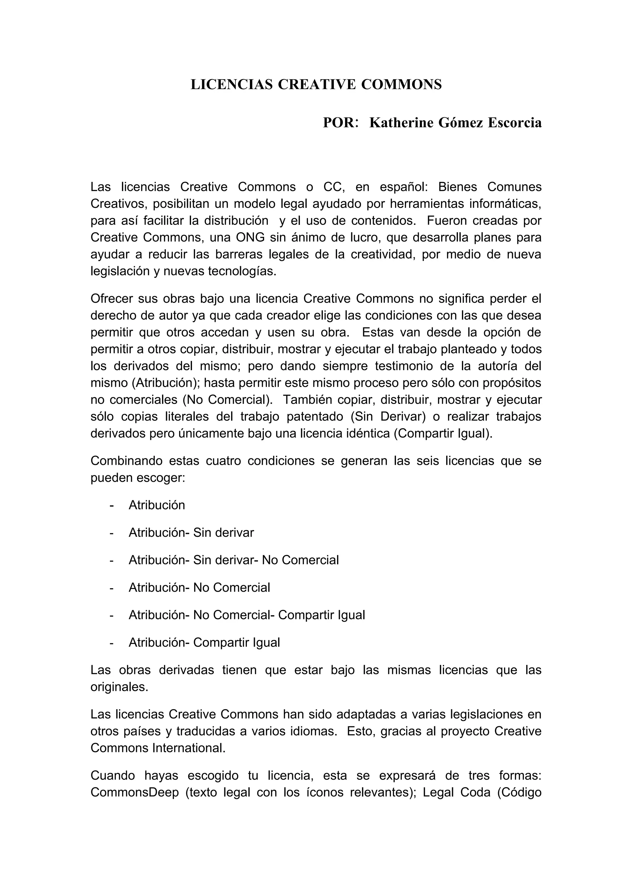 Las licencias Creative Commons permiten a los creadores compartir sus obras bajo diferentes condiciones como permitir el uso no comercial, requerir la atribución de la autoría o prohibir obras derivadas. Ofrecen seis opciones de licencia que combinan estas condiciones. Fueron creadas por Creative Commons, una ONG, para facilitar la distribución legal de contenidos reduciendo barreras a la creatividad.