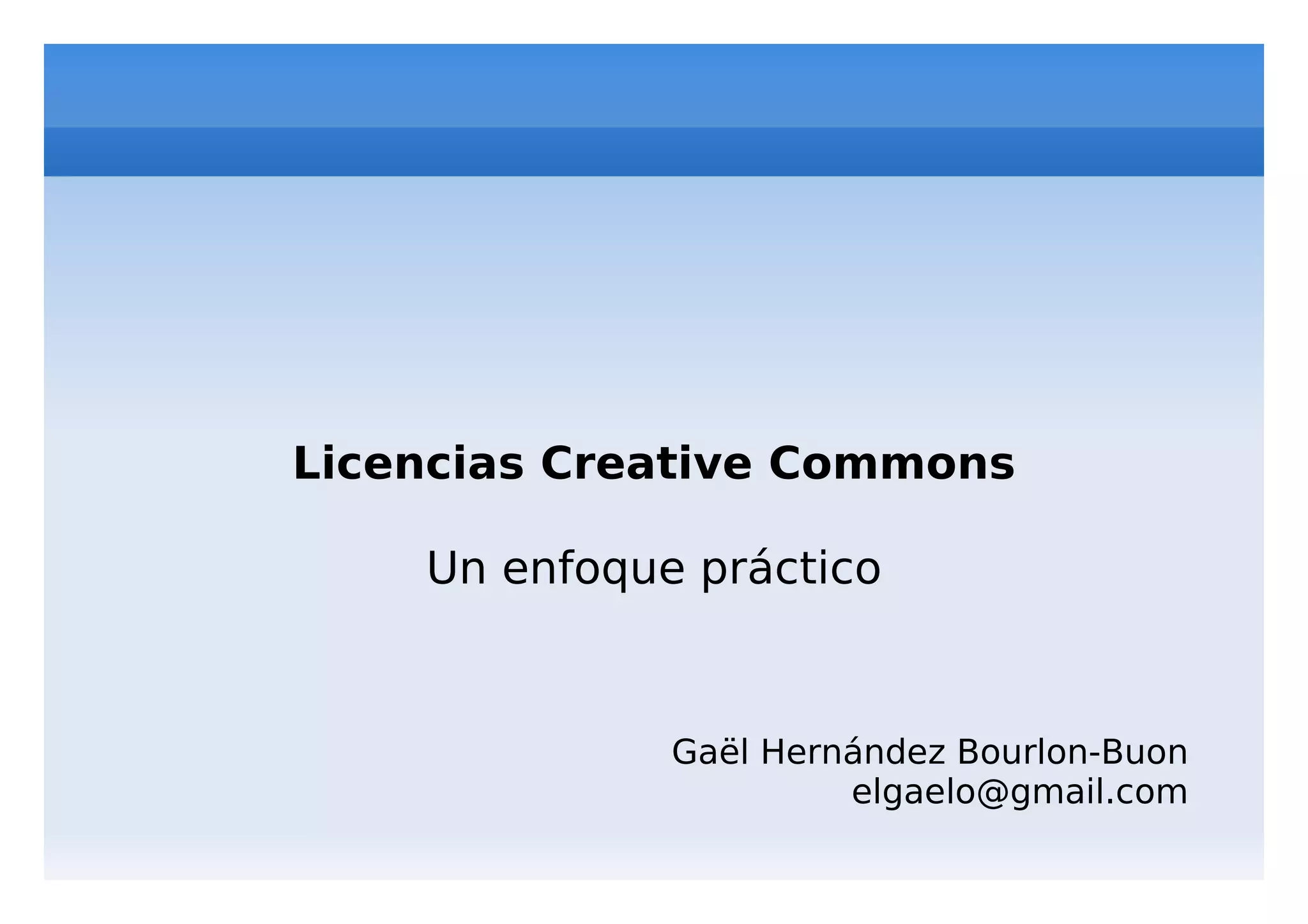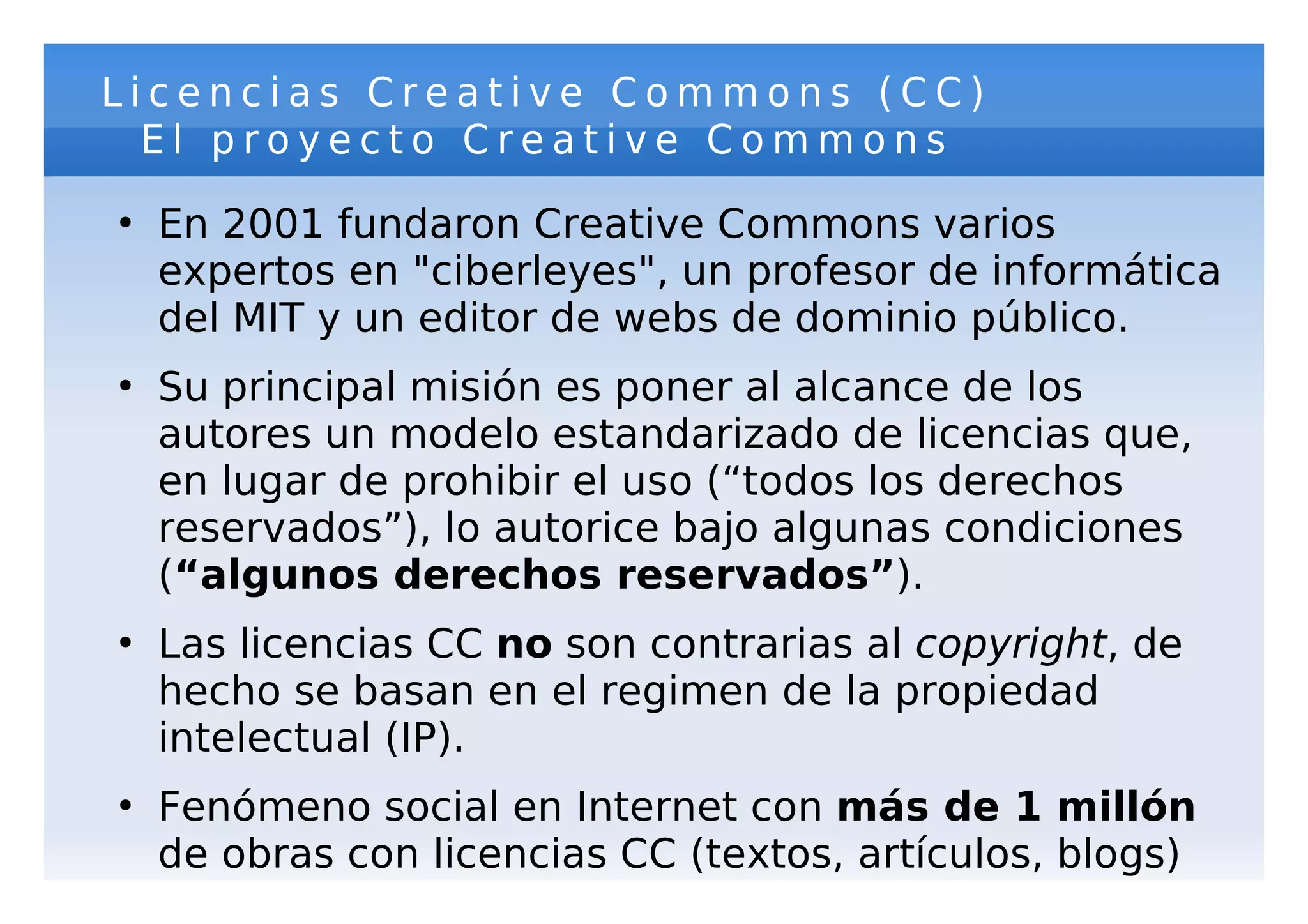 Este documento explica las licencias Creative Commons (CC), las cuales permiten a los autores especificar cómo otros pueden usar y compartir su trabajo. El proyecto CC ofrece seis tipos de licencias que varían en términos de si se permite uso comercial, modificaciones, o distribución bajo la misma licencia. Las licencias CC proporcionan una alternativa al copyright tradicional de "todos los derechos reservados" al permitir el uso de obras bajo ciertas condiciones.