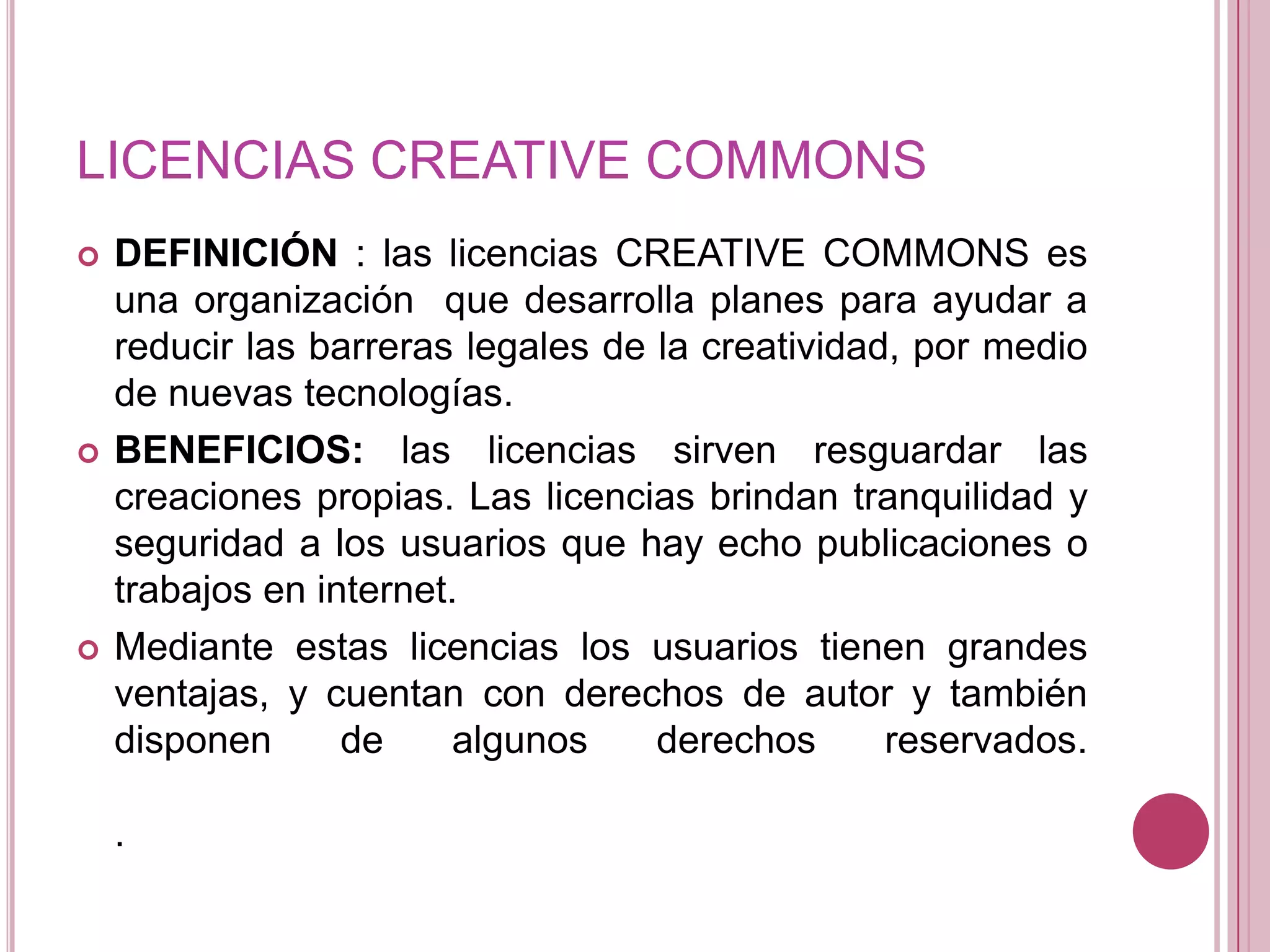 Las licencias Creative Commons son una organización que desarrolla planes para reducir las barreras legales de la creatividad mediante nuevas tecnologías. Ofrecen beneficios como proteger las creaciones propias y brindar tranquilidad a los usuarios que publican trabajos en internet. Existen tres tipos de licencias Creative Commons: reconocimiento, no comercial y sin derivar, que permiten distribuir y exhibir el material original con diferentes condiciones.
