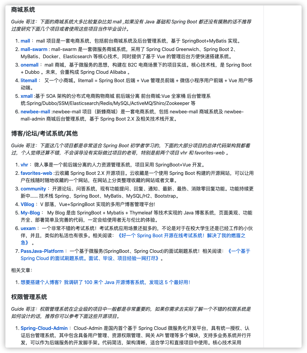 | 39 | +你可以参考 [Java 优质开源实战项目](https://javaguide.cn/open-source-project/practical-project.html) 上面推荐的实战类开源项目,质量都很高,项目类型也比较全面,涵盖博客/论坛系统、考试/刷题系统、商城系统、权限管理系统、快速开发脚手架以及各种轮子。 |