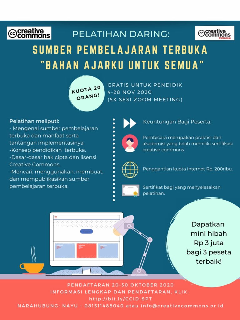 Creative Commons Indonesia membuka kesempatan bagi pendidik di Indonesia untuk mengikuti pelatihan daring mengenai Sumber Pembelajaran Terbuka (SPT) atau yang lebih umum dikenal dengan OER (Open Educational Resources). Sumber Pembelajaran Terbuka sudah digaungkan oleh berbagai pihak, baik lembaga internasional maupun nasional, seperti UNESCO, Creative Commons, SEAMOLEC, Kemendikbud, Universitas Terbuka, dan beberapa gerakan keterbukaan seperti Open Education, Open Access, dan Open Science. Terlebih pada masa pandemi ini, inisiatif penggunaan SPT dalam pembelajaran semakin meningkat karena kebermanfaatannya yang luas.