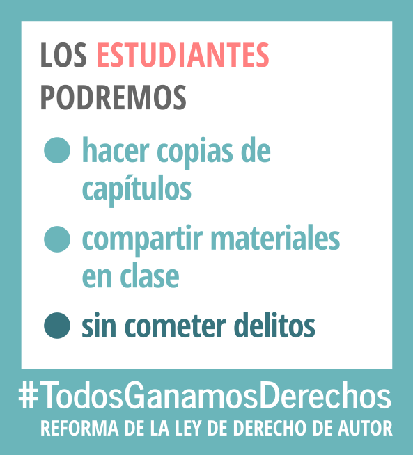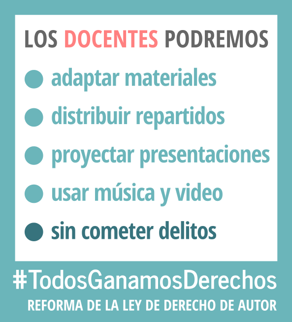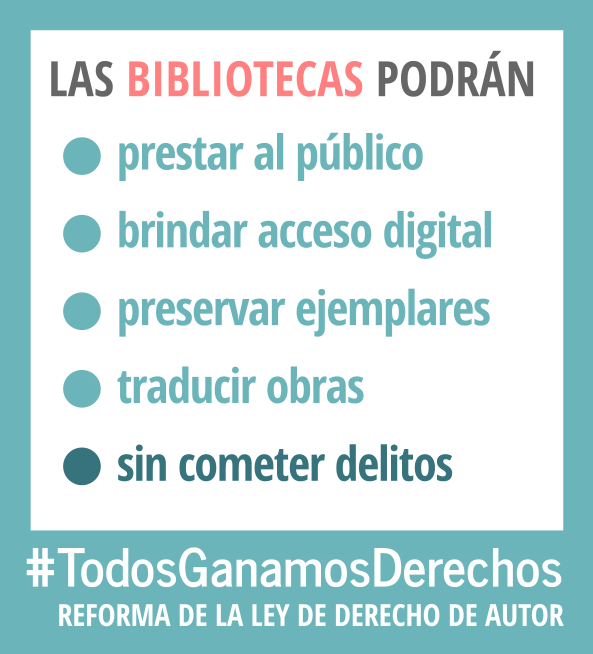 Esta semana se hizo pública una carta ciudadana en apoyo a la reforma de la ley de derecho de autor, bajo el título «Todos ganamos derechos«. En muy pocos días la carta ganó más de 300 adhesiones, entre ellas las de escritores y músicos, así como personalidades de la cultura, docentes, bibliotecarios, estudiantes y usuarios.