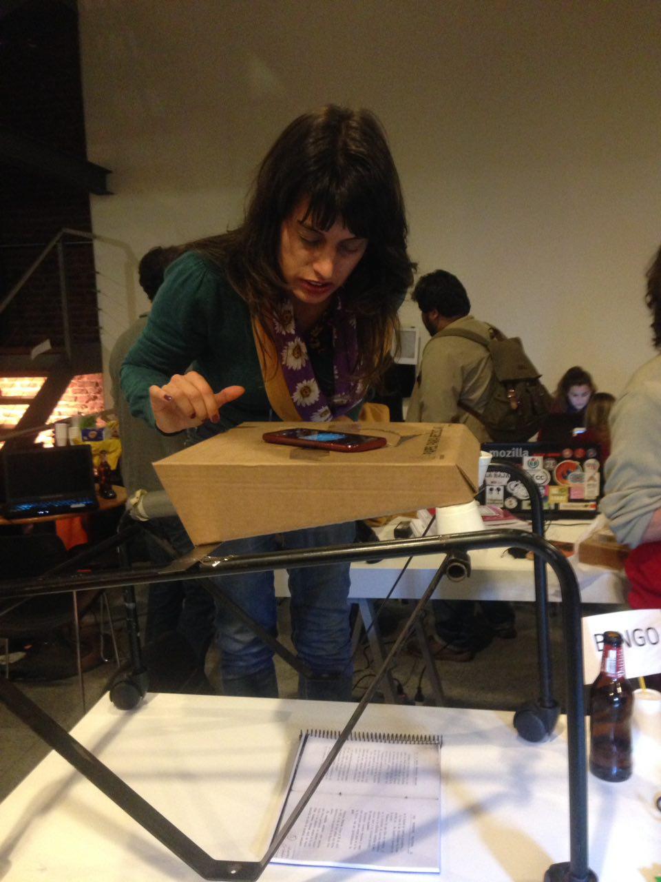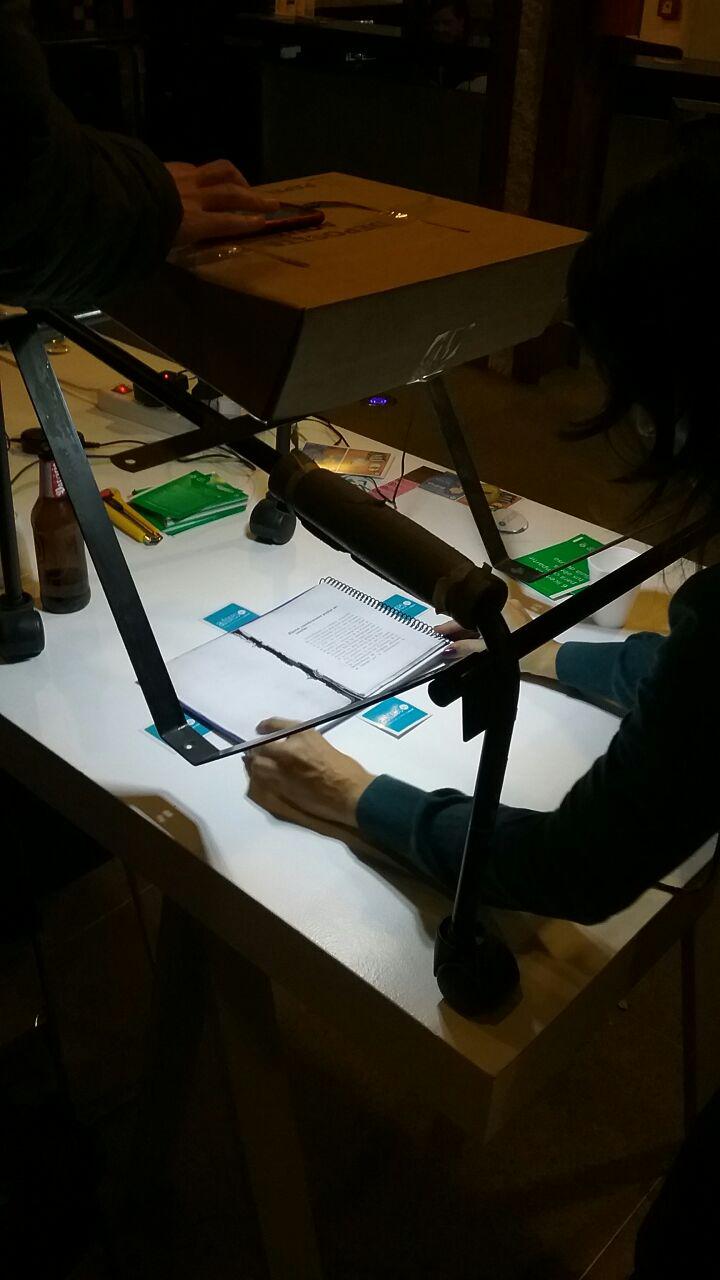 No faltó el momento creativo de la noche. Una participante de la Nerdatón trajo una obra en un formato que no entraba en el escáner de libros DIY y hubo que apelar a los implementos que teníamos a mano en el CCE para crear un digitalizador.