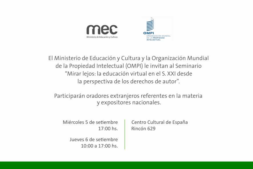 El 5 y 6 de septiembre tendrá lugar el Seminario Nacional «Mirar Lejos: la educación virtual en el siglo XXI desde la perspectiva de los derechos de autor» en el Centro Cultural de España (Rincón 629, Montevideo).
