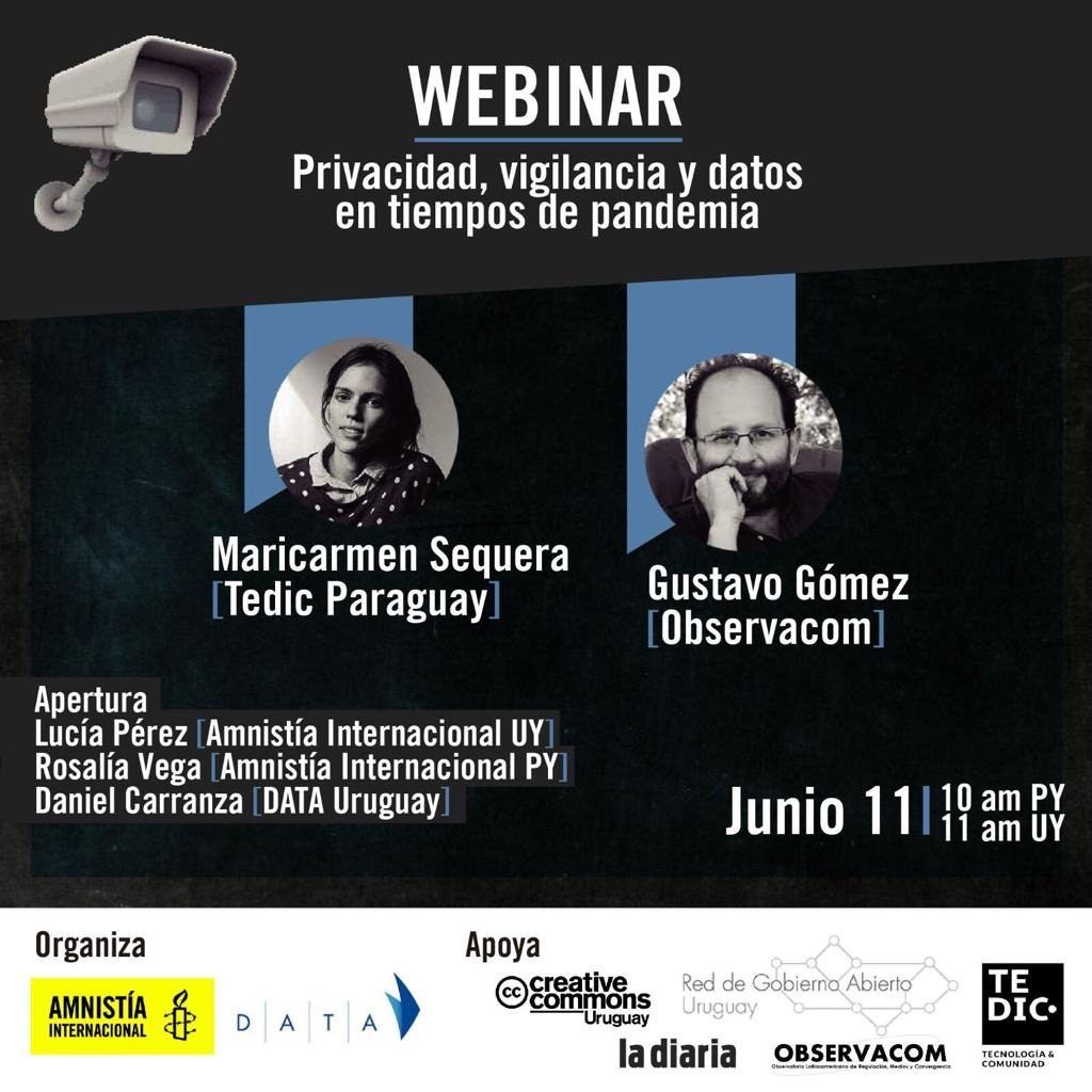 El webinar es brindado por Maricarmen Sequera, miembro de Tedic y de Creative Commons Paraguay, y por Gustavo Gómez, de Observacom. La apertura la harán Lucía Pérez de Amnistía Uruguay, Rosalía Vega de Amnistía Paraguay y Daniel Carranza de Data Uruguay.